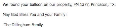 Someone found one of Hadley's balloons that we released at her 1st birthday celebration :) Isn't that amazing??